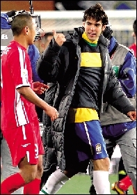 賽前大屏幕用視頻方式公布各隊首發(fā)名單,卡卡出現時,引發(fā)了全場最響亮掌聲和尖叫聲。當卡卡踏上球場,球迷的呼喊聲也是最大的。但比賽中的卡卡讓球迷失望了。卡卡每次拿球身邊總會有3名球員包夾。帶球被搶斷、傳球不到位、多次被撞翻,甚至帶球急停時摔跤。很顯然,卡卡的身體狀態(tài)非常糟糕。第80分鐘,卡卡被換下。賽后,心煩的卡卡甚至拒絕了鄭大世交換球衣的要求。