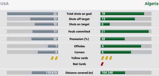 本場比賽,美國隊(duì)和阿爾及利亞隊(duì)都有很多進(jìn)球的機(jī)會(huì)。其中美國隊(duì)全場22腳射門,10腳擊中門框范圍內(nèi),12腳射偏。美國隊(duì)的射門精度明顯高于阿爾及利亞,后者全場19腳射門只有4腳射入球門框范圍內(nèi)。全場比賽看來,美國隊(duì)的攻勢明顯更有威脅。