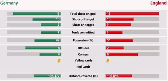 角球方面,德國隊(duì)有4個,少于英格蘭隊(duì)的6個,其中英格蘭隊(duì)利用第一次角球的機(jī)會敲開了德國隊(duì)的大門。