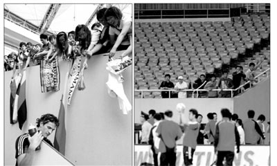 然而,這樣的熱烈氛圍隨著中國隊的到來消散殆盡。當(dāng)?shù)聡犕藞、中國隊進場時,近2000名球迷竟然像潮水退潮一般,轉(zhuǎn)眼就迅速地隨德國隊一同離場。一名女球迷在撤退時向同伴高喊:“中國隊來了,快跑!”最終堅持留在體育場看中國隊訓(xùn)練的球迷,竟然只有屈指可數(shù)的8個人。(記者鄭小龍)
