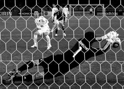 昨晚,東京溫度降至零下3℃,依然有不少熱情的中國球迷從日本其他城市趕到東京為國足助威。本場(chǎng)比賽,高洪波將重心放在防守上,國足繼續(xù)排出4231陣型,郜林擔(dān)任單箭頭。第31分鐘,國足前場(chǎng)左側(cè)連續(xù)快節(jié)奏傳遞,榮昊將球挑傳至禁區(qū)線附近,郜林轉(zhuǎn)身攻門可惜被中澤佑二擋出,第42分鐘,日本隊(duì)在左右兩側(cè)連續(xù)形成滲透配合,玉田圭司近距離包抄低射打偏。上半場(chǎng),雙方勢(shì)均力敵。