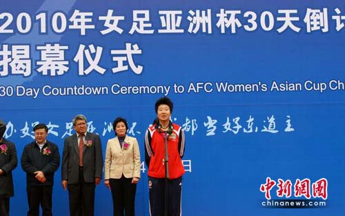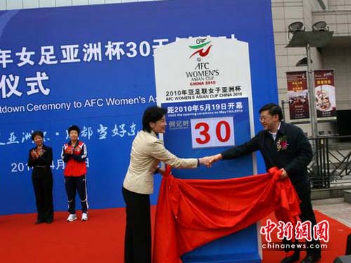 中新網(wǎng)成都4月20日電(記者 楊杰)20日下午,2010年女足亞洲杯30天倒計時揭幕儀式在成都舉行,中國足協(xié)副主席薛立、成都市副市長傅勇林、中國女子足球隊教練陳金剛、中國女子足球隊隊長畢妍,以及泰國駐成都總理事孫建功等出席了揭幕儀式。