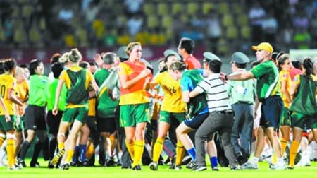 8月3日晚,中國青年女足在武漢2∶1險勝澳大利亞隊,亞青賽兩連勝提前小組出線,但在比賽結束后,雙方發(fā)生沖突,一名澳大利亞球員將中國球員張越打倒,雙方替補球員和教練見狀全部沖到場內,一片混亂之后,經(jīng)過亞足聯(lián)官員的親自協(xié)調,事件才平息。據(jù)了解,澳球員之所以“發(fā)飆”,是覺得輸?shù)煤堋案C囊”,覺得“中國隊做了裁判工作”。路透社的報道說“這起事件無疑對中國足球的聲譽又是一次打擊。 ”但事實上,算上上周日中超聯(lián)賽重慶隊主教練阿里·哈恩的“瘋狂咆哮”,連續(xù)兩次都是外國教練和外國球員在中國綠茵撒野,這里必須要問一句:憑什么?