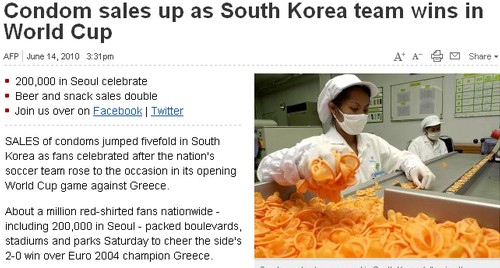 中新網(wǎng)6月15日電 在12日南非世界杯B組首輪小組賽中,韓國2比0擊敗希臘,而這場比賽的慶祝熱潮一直延續(xù)到了三天之后。據(jù)韓國媒體報(bào)道,韓國國內(nèi)避孕套的銷量大漲了將近五倍。