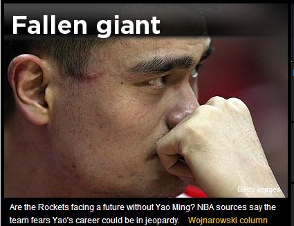 中新網(wǎng)6月30日電 北京時間今日凌晨,雅虎體育以“巨人的墜落”為題報道稱:姚明腳踝傷勢已非常嚴重,可能缺席下賽季大部分常規(guī)賽。隨后美國媒體紛紛對此事發(fā)表評論。