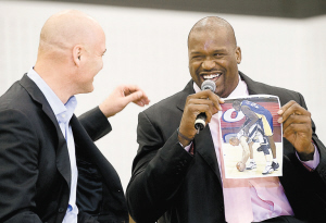 等吉爾伯特送完禮物,費(fèi)里和邁克·布朗正兒八經(jīng)地說(shuō)了幾句開(kāi)場(chǎng)白,終于輪到奧尼爾了。他果然出口不凡:“謝謝偉大的丹尼·費(fèi)里把我?guī)У竭@里來(lái)。那天我接到丹尼·費(fèi)里的電話,我就念叨,丹尼·費(fèi)里,我要用電腦查查,他究竟是誰(shuí),結(jié)果一查,就出來(lái)這張圖片!