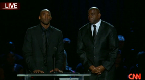 在追思會進行到中斷的時候,約翰遜和科比身著黑西裝緩緩步入講臺?票仍诎l(fā)表感言時說,“我們每個人都應該銘記邁克爾·杰克遜的貢獻,他活在我們的記憶中.在臺上和臺下的他一樣精彩,他永遠與我們同在!