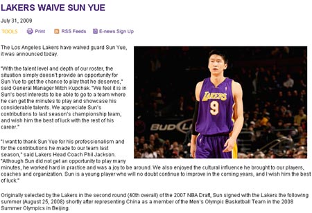 中新網(wǎng)8月1日電 當(dāng)?shù)貢r間7月31日,NBA上賽季冠軍湖人隊通過官方網(wǎng)站,宣布放棄來自中國的后衛(wèi)孫悅。