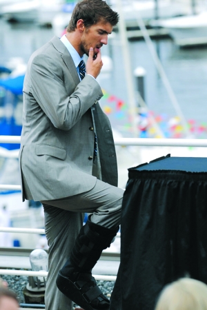 對菲爾普斯來說,戰(zhàn)勝奧尼爾似乎不那么簡單,因為他在之前的車禍中弄傷了右腳,發(fā)布會上,他全程都用護具緊緊包裹著傷腳,但是菲爾普斯笑著說:“兵不厭詐,這個護具將會對奧尼爾造成困惑,他一定會迷惑我到底能發(fā)揮到幾成,哈哈,我們賽場上見!