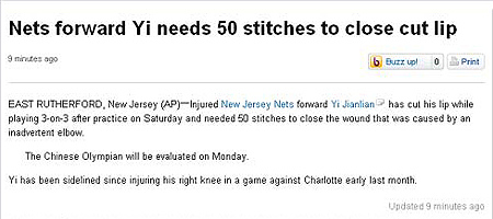 中新網(wǎng)12月7日電 北京時(shí)間昨日,據(jù)美聯(lián)社報(bào)道,易建聯(lián)在新澤西當(dāng)?shù)貢r(shí)間周六早上的一場三對三訓(xùn)練中被隊(duì)友用手肘打破了上嘴唇。因?yàn)閭麆輫?yán)重,竟被縫了50針。