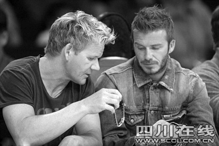 和小貝一起看球的,是英國(guó)頂級(jí)廚神戈登·拉姆塞,因其在各種名人烹飪節(jié)目中粗魯、嚴(yán)苛,以及追求完美的風(fēng)格,被媒體稱為“地獄廚師”。貝克漢姆與拉姆塞的關(guān)系匪淺,正是小貝幫助拉姆塞進(jìn)入了洛杉磯的名人圈子,并幫助他打響了在美國(guó)的招牌。當(dāng)天,拉姆塞就坐在小貝包下的價(jià)值2200美元的座位上,也許是場(chǎng)上湖人的表現(xiàn)確實(shí)不佳,兩人無(wú)聊之
