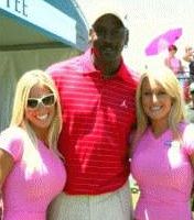 近日,喬丹在一項高爾夫比賽中仍然是“一個人”,不過,他與場邊的兩位身著粉紅套裝的金發(fā)大波美眉打得火熱,美國八卦媒體報導時還聲稱,喬丹是與這兩位大胸艷女一起離開,并在文章中感嘆:喬丹永遠都是偉大的。
