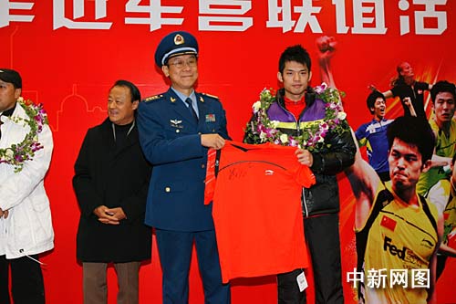 中新網(wǎng)上海十一月十七日電 (宗晨亮)十七日,“李寧·2009中國(guó)羽毛球公開賽”在上海源深體育中心拉開帷幕。國(guó)家羽毛球隊(duì)總教練李永波帶著沒有比賽任務(wù)的林丹、王儀涵來到某部隊(duì),舉行世界羽毛球冠軍進(jìn)軍營(yíng)聯(lián)誼活動(dòng)。