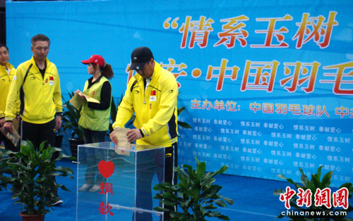 比賽開始前,中國(guó)羽毛球隊(duì)全體運(yùn)動(dòng)員、教練員和工作人員為玉樹災(zāi)區(qū)進(jìn)行現(xiàn)場(chǎng)捐款。此外,此次賑災(zāi)義賽得到眾多企業(yè)的支持,恒安國(guó)際集團(tuán)捐款50萬元人民幣,李寧(中國(guó))體育用品有限公司、北京夢(mèng)奧公司(聯(lián)邦快遞)、紅牛維他命飲料有限公司、喜得龍(中國(guó))有限公司分別捐款10萬元。