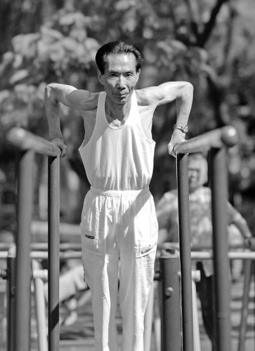 去采訪的攝影記者很年輕,自然想上杠試上一試,沒想到五六個(gè)便已支撐不下去了,羞得小伙子直說:“大爺,沒法和你比,太厲害了。”