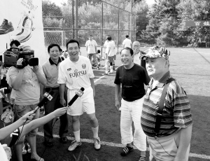 昨天這場(chǎng)“名腳”與“國(guó)手”之間的球場(chǎng)對(duì)話在朝陽(yáng)公園足球場(chǎng)舉行,一張張熟悉的面孔將很多游客吸引到場(chǎng)邊觀戰(zhàn)。除了兩隊(duì)的隊(duì)員外,曾分別擔(dān)任過足協(xié)主席和中國(guó)棋院黨委書記的足壇名帥年維泗、前中國(guó)棋院院長(zhǎng)王汝南以及中國(guó)女足主帥商瑞華三位老人也冒著30多攝氏度的高溫趕來觀戰(zhàn)。
