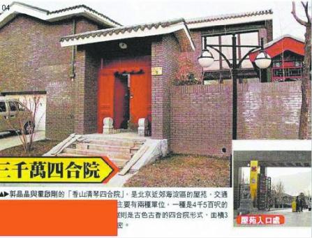 現(xiàn)在,越來越多的跡象都在表明郭晶晶和霍公子的婚期已近。昨天,香港一媒體爆出郭晶晶正準(zhǔn)備裝修去年霍家所贈的價值3000萬人民幣的豪華別墅,并稱“這很有可能就是他們倆在北京的婚房!”據(jù)說,這套別墅位于北京海淀區(qū)四季青鎮(zhèn)門頭村,在五環(huán)以外。據(jù)記者了解,該樓盤的中式院落獨棟別墅面積為300—550平米之間,另外,每棟別墅送150平米的地下室。該別墅在2007年的預(yù)估開盤價就高達(dá)55000—60000元/平米。難怪媒體都將這一帶的房子稱作“北京頂級私人豪宅群落!