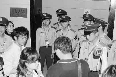 郭晶晶是否真的去找吳敏霞了?這個記者并不清楚,不過據(jù)記者了解吳敏霞不出席新聞發(fā)布會是因為害怕被“誤傷”。在郭晶晶第一次離開新聞發(fā)布會現(xiàn)場時,記者也跟了出去。吳敏霞當(dāng)時剛剛接受完央視的采訪正準備走進更衣室,但此時竟然有一位簽名的男FANS跟著吳敏霞走進了更衣室,不過好在現(xiàn)場武警反應(yīng)迅速,將他“揪了”出來。見現(xiàn)場形勢已經(jīng)非;靵y,武警索性集體站在了女更衣室的門口,一位現(xiàn)場工作人員邊打著電話,邊嚷著“守好,誰都不讓進去”。
