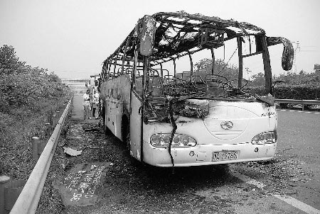 昨日上午11時(shí)30分,幾名交警正在現(xiàn)場(chǎng)指揮拖車把這輛燒得面目全非的客車拖走。記者看到,這輛車牌為川A79769的客車已被燒成了黑漆漆的光架子,車內(nèi)30多把座椅也只剩下鐵架,右側(cè)的車頭裂了一條一米多長(zhǎng)的縫隙,車尾的后擋板完全被燒毀,露出了車內(nèi)的零件。地面更是一片狼藉,黑水橫流,空氣中彌漫著一股濃烈的焦臭味。