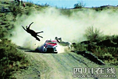 阿根廷賽車手費(fèi)·比亞格拉正在阿根廷南部參加汽車?yán)。賽車行駛到?nèi)格羅河省的羅卡將軍城附近時(shí),遇到三匹馬正在穿越公路。比亞格拉只看到其中兩匹,等發(fā)現(xiàn)第三匹馬時(shí)已經(jīng)來(lái)不及躲避了,賽車和馬猛烈相撞后將馬撞得凌空而起。這起事故造成這輛三菱賽車的前半部分損傷不輕,但是比亞格拉僅僅因?yàn)槭鹿实⒄`了30秒鐘,隨后駕駛著賽車?yán)^續(xù)前進(jìn),并且完成了當(dāng)天的全程比賽。(新華社)