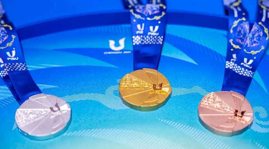 獎牌形態(tài)呈現出不規(guī)則的圓形,以致敬太陽與青春;獎牌會徽面特設“文明時光墻”,刻畫了從象形文字“蜀”到現代漢字“雄起”等不同時期的中國文字