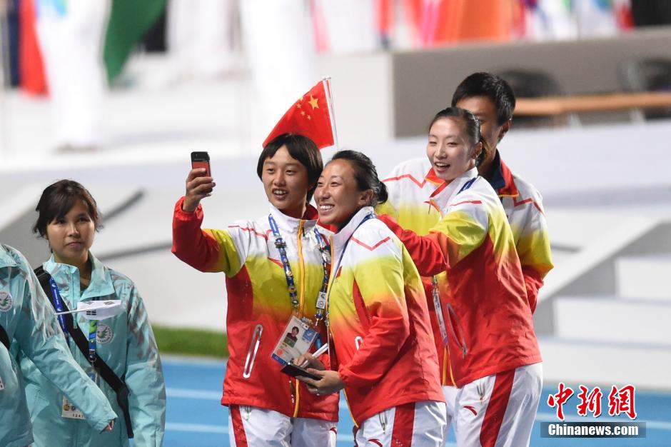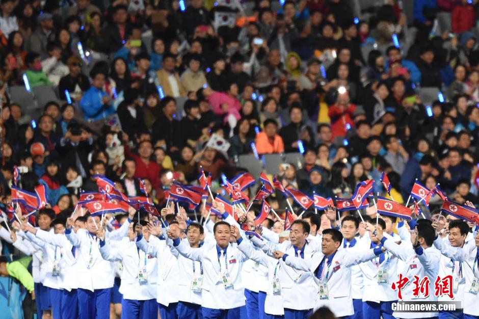 第17屆亞運(yùn)會于4日晚在仁川主體育場舉行閉幕式,朝鮮高級代表團(tuán)成員出席。當(dāng)?shù)貢r間晚8時10分許,當(dāng)朝鮮運(yùn)動員入場時, 黃炳誓等人起立向運(yùn)動員揮手致意,體育場內(nèi)掌聲響起。