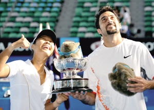 在2008澳網(wǎng)最后的決戰(zhàn)日,中國金花孫甜甜幸運(yùn)地舉起了冠軍獎杯,她和塞爾維亞選手澤蒙季奇搭檔在混雙決賽中贏得了勝利。孫甜甜為中國女網(wǎng)贏得了第三座大滿貫冠軍獎杯,而澤蒙季奇則為塞爾維亞奪取了首個大滿貫冠軍。