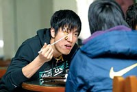 劉翔迅速返回公寓,套上帽衫,陽光很燦爛,劉翔很愜意,他“大搖大擺”、仰著頭,輕哼著流行歌走向食堂!皝砹税!”一走進二樓田徑隊的飯?zhí),立即有廚師倍兒親切地招呼他,劉翔笑著說“餓了”?鐧诮M幾個人坐到東北角,這是他們的“老地方”。接著劉翔和大伙兒一起排隊,盛上青菜、棒骨、肉末燉粉條、炒雞蛋和白米飯,又拿了個柚子。