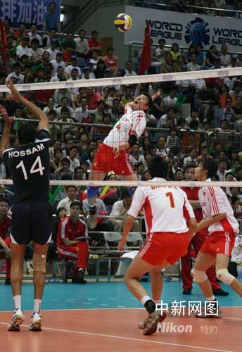 比賽開始后,中國隊的陣容依舊和上周相同,主攻沈瓊、崔建軍,副攻于大偉、邊洪敏,接應(yīng)二傳袁志,二傳焦帥以及自由人任琦。