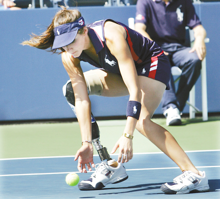 因為在六月的紐約鐵人三項賽殘疾人組中表現出色,她被賽事組織者,也是美網董事會成員霍夫看中,受邀來美網當球童。但這并不是一份“保送通知書”,布魯諾和幾百位健全人一起參加了兩輪“海選”。通過第一輪之后,她和備戰(zhàn)美網的球員一樣開始艱苦訓練,不是雙手反手回球,也不是單手大力抽擊,而是雙手快速撿球、單手準確擲球。當終于登上美網賽場,“那些比我小很多的球童只是好奇,這里怎么會有個‘鋼鐵俠’,他們完全忘記我失去了一條腿”。