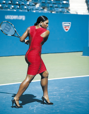 腳穿高跟鞋,擺起了POSE。大威笑著說:“時尚是要付出代價的,真打網(wǎng)球,可不敢這么穿! (李輝)