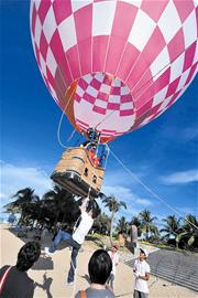 彩排中一個(gè)巨大的熱氣球無疑是最大焦點(diǎn),氣球上寫著“云中漫步”四個(gè)大字,待熱氣球緩緩升起,記者才看明白,原來是楊云和伴娘孫曉姣兩人將在空中來一趟“云中漫步”。具體過程是,楊云和孫曉姣在工作人員的幫助下,熱氣球從百米開外的一處小碼頭“漫步”到愛情廣場上空,等待楊威和國家體操隊(duì)的5名“黃金”伴郎的到來。