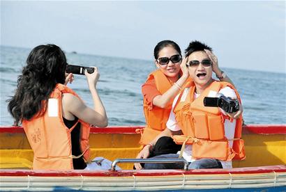 當(dāng)然,昨日彩排的時(shí)候,5位伴郎還沒有抵達(dá)三亞,而且楊威的海上旅程和楊云的空中旅程分開彩排。因此,在這一環(huán)節(jié),楊威、楊云和孫曉姣同坐一條艇,而本報(bào)兩名記者和楊威、楊云的隨行人員則客串伴郎分乘另外三條艇,來了一次海上“漫步”。