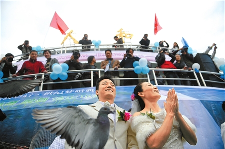 西昌邛海邊,700多名來賓,昨天見證了奧運(yùn)會(huì)冠軍殷劍與陳勇的水上婚禮。殷劍在婚禮后也幸福地宣稱:從現(xiàn)在開始,我們正式告別“光棍”行列。三年的愛情,一朝喜獲豐收!為了與親朋好友分享這一幸福,他們在邛海賓館擺下了72桌喜宴。