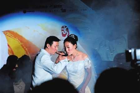 邛海水面上,八艘帆船來(lái)回穿梭。殷劍的小師弟、小師妹以特殊的方式,為自己的師姐助興。而在承辦婚禮的邛海賓館內(nèi),帆船的風(fēng)帆成為最醒目的路標(biāo):一個(gè)箭頭標(biāo)明了方向,一行小字寫(xiě)著:“幸福的小船”。下午5點(diǎn)過(guò),兩艘白色的小艇從不同方向慢慢駛向碼頭,新郎、新娘同時(shí)靠岸。率先上岸的新郎牽著新娘的手,慢慢走上游艇。雙雙放飛了象征愛(ài)情的信鴿。新郎、新娘在船頭完成了最深情的一吻。