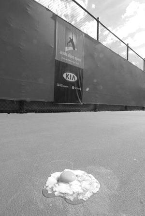 果然,昨天一大早,炙熱的陽光便烤得人們頭昏眼花,氣溫也很快躥升到40攝氏度以上,使得整個墨爾本像一個大火爐。據(jù)報道,墨爾本郊外的鐵軌在烈日暴曬下,部分已經(jīng)變形,火車因此延誤。有記者在賽場中央試著打了個雞蛋,沒想到雞蛋竟被煎熟了。