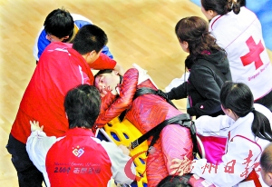 比賽結(jié)束后,孔雪回到了運動員休息室。在等了片刻后,她才在一名醫(yī)院陪護人員的陪同下,通過漫長的運動員通道,緩緩上了救護車。