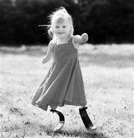 埃莉在16個月大時患上嚴重的腦膜炎,引發(fā)了敗血癥,導致四肢肌肉全部壞死。為了挽救埃莉的生命,醫(yī)生通過6小時的手術截掉了她開始發(fā)黑的四肢。手術數(shù)周后,埃莉便穿戴上了生平第一套假肢。可是由于它不夠靈活,加上穿著起來很痛苦,埃莉每天穿假肢的時間不超過20分鐘!盁o肢女童”埃莉的不幸遭遇經(jīng)媒體報道后,感動了無數(shù)英國人。2006年12月,在眾多好心人的資助下,埃莉換上一副可移動的高科技假手和假腿。有了這副帶膝關節(jié)的假腿之后,埃莉即便不借助任何輔助物支撐,也能獨自站立3分鐘。剩余的大部分時間,她只需一副迷你行走支架,便可保持全身穩(wěn)定,甚至可以獨立爬上樓梯。靠著一雙假臂,埃莉可以自己穿衣,甚至可以夾著一把牙刷完成刷牙這樣的“高難動作”。