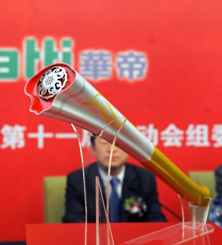 4月28日上午11時,第十一屆全國運動會火炬——“如意”在濟南揭開神秘面紗,首次在公眾面前亮相。
