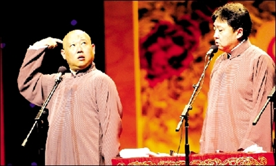 德云社的張德武、劉源以新編相聲《成長的煩惱》開場,他們拿馬諾在《非誠勿擾》中經(jīng)典的“寧愿坐在寶馬車里哭,也不坐在自行車后面笑”砸掛,現(xiàn)場效果很好。郭德綱、于謙登臺合說了《夸住宅》,干脆利落的貫口贏得陣陣喝彩。走下臺的郭德綱說,搭檔于謙給了他不少驚喜,很多臨時發(fā)揮的話接得很到位。