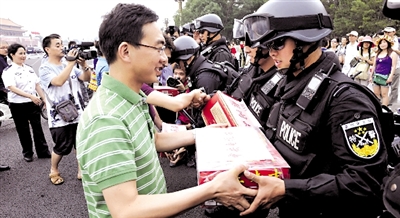 昨天下午,李瑞英、朱軍、郎永淳等中央電視臺(tái)和北京電視臺(tái)的十多位名嘴,為正在執(zhí)勤的特警隊(duì)員和交警,送去酸梅湯等夏季消暑飲品。近日,市公安局巡特警總隊(duì),在長安街沿線及重點(diǎn)地區(qū)加強(qiáng)了巡邏防控和武裝震懾。據(jù)了解,特警們每人每天身上的槍支、防彈衣等裝備,需要負(fù)重?cái)?shù)十公斤!案邷乜崾,特警們還著裝整齊,一站十多個(gè)小時(shí),他們確實(shí)是最值得尊重的!敝燔娬f。 記者 董世彪 郭曉樂 攝影報(bào)道