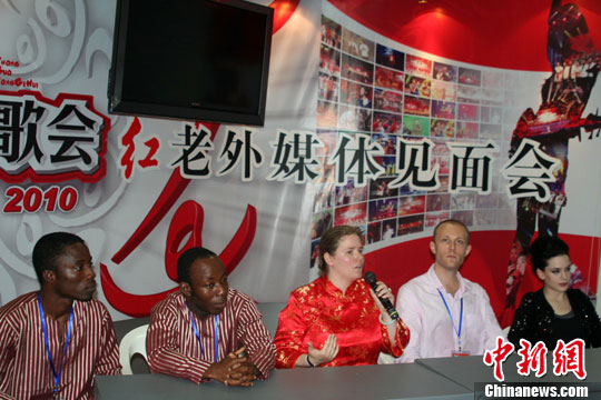 中新網(wǎng)南昌7月10日電(劉占昆)2010中國紅歌會突圍戰(zhàn)即將全面打響,10日下午,闖進(jìn)全國120強(qiáng)選手中的五位老外率先亮相在媒體見面會上,他們不僅現(xiàn)場唱起紅歌,還相互調(diào)侃耍寶。