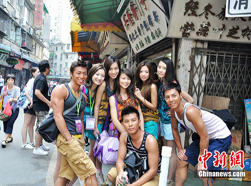 中新網(wǎng)韶關(guān)7月19日電(記者 李凌)7月19日上午,在廣東韶關(guān)進行外景拍攝和采風(fēng)的2010年準港姐、港男在游覽市區(qū)時,受到當?shù)厥忻駠^。陪同前往的08年港姐高海寧更是備受矚目,成市民眼中最靚佳麗。