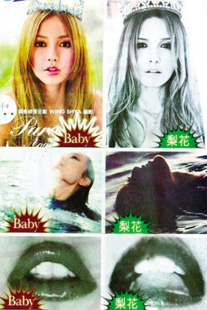 對比二人的寫真照,當中Angelababy頭戴皇冠的封面及內頁的黑白嘴唇特寫,與梨花的相似度達9成!而側面的出水芙蓉照、戴皇冠的回望照及黑帽魔術師照,無論造型與拍攝角度亦有8成半相似。