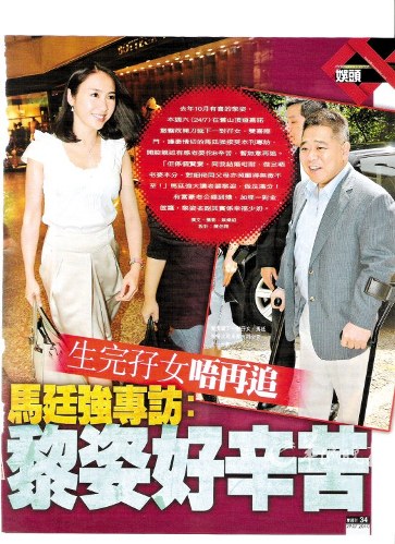 記者問他有沒有進(jìn)產(chǎn)房陪太太,馬廷強(qiáng)說:“我沒進(jìn)產(chǎn)房。黎姿要打麻醉針,加上我拄著拐杖,不是很方便,所以留在產(chǎn)房外等。她生完BB后從手術(shù)室出來,我就立刻去看她!