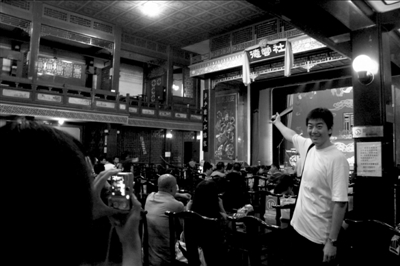 晚上7點半,演出正式開始,德云社元老邢文昭先生表演單口相聲《文昭關(guān)》。此時上座率剛剛過半,觀眾都很安靜地聽相聲,邢先生抖包袱后,大家也是試探著“噫”了幾聲,反倒是邢先生挺放得開,“叫好就痛快點”。德云社門前停著于謙的座駕,但在后臺,記者沒有看到他和郭德綱的身影。