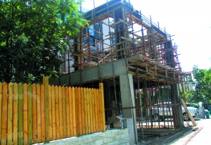 近日,該小區(qū)3區(qū)19號(hào)1棟正在裝修,工人在樓外圍起柵欄,占用人行道和公共綠地,并在其房屋后門外加蓋兩層建筑。業(yè)主稱加蓋后將嚴(yán)重影響鄰居采光。