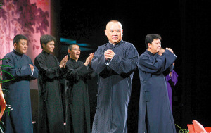 郭德綱、于謙合作10周年專場演出14日如約開場,現(xiàn)場座無虛席。此番亮相的郭德綱顯得頗為低調(diào),他在對話中表示,自己只是一個說相聲的,“能力有限,水平一般”。此次演出郭德綱個人為舟曲災(zāi)區(qū)捐出了10萬元,德云社和演出承辦方也各捐出5萬元,對于因?yàn)榘У咳斩鴷和5?5日的演出,郭德綱表示:所有15日票的觀眾都可以去退票,也可以留著,等我們開演的時候繼續(xù)使用,F(xiàn)在不是我們不訂演出時間,實(shí)在是北展后面的演出太多了,一切需要重新協(xié)調(diào)!