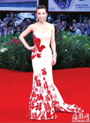 清冷了多日的威尼斯紅毯秀終于因?yàn)椤兜胰式苤ㄌ斓蹏范杆偕郎,影片的主?chuàng)也令華語電影人氣勢十足。此前,李冰冰要在威尼斯紅毯上穿“青花瓷”禮服的消息被傳得沸沸揚(yáng)揚(yáng),她和范冰冰的“碰瓷”還一度成為熱炒話題。但在昨天的紅地毯上,李冰冰并沒有選擇提前曝光的“青花瓷”,而是選了另一套“百福圖”的戰(zhàn)袍。