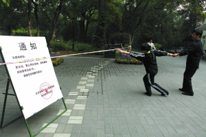 在公園門口和警戒線旁,均貼出落款為公園管理處的通知:“因公園9月25日有重要活動(dòng),需占用此場地,望各晨練群體暫;顒(dòng)1天”,通知中的時(shí)間部分有被白紙粘貼的痕跡。
